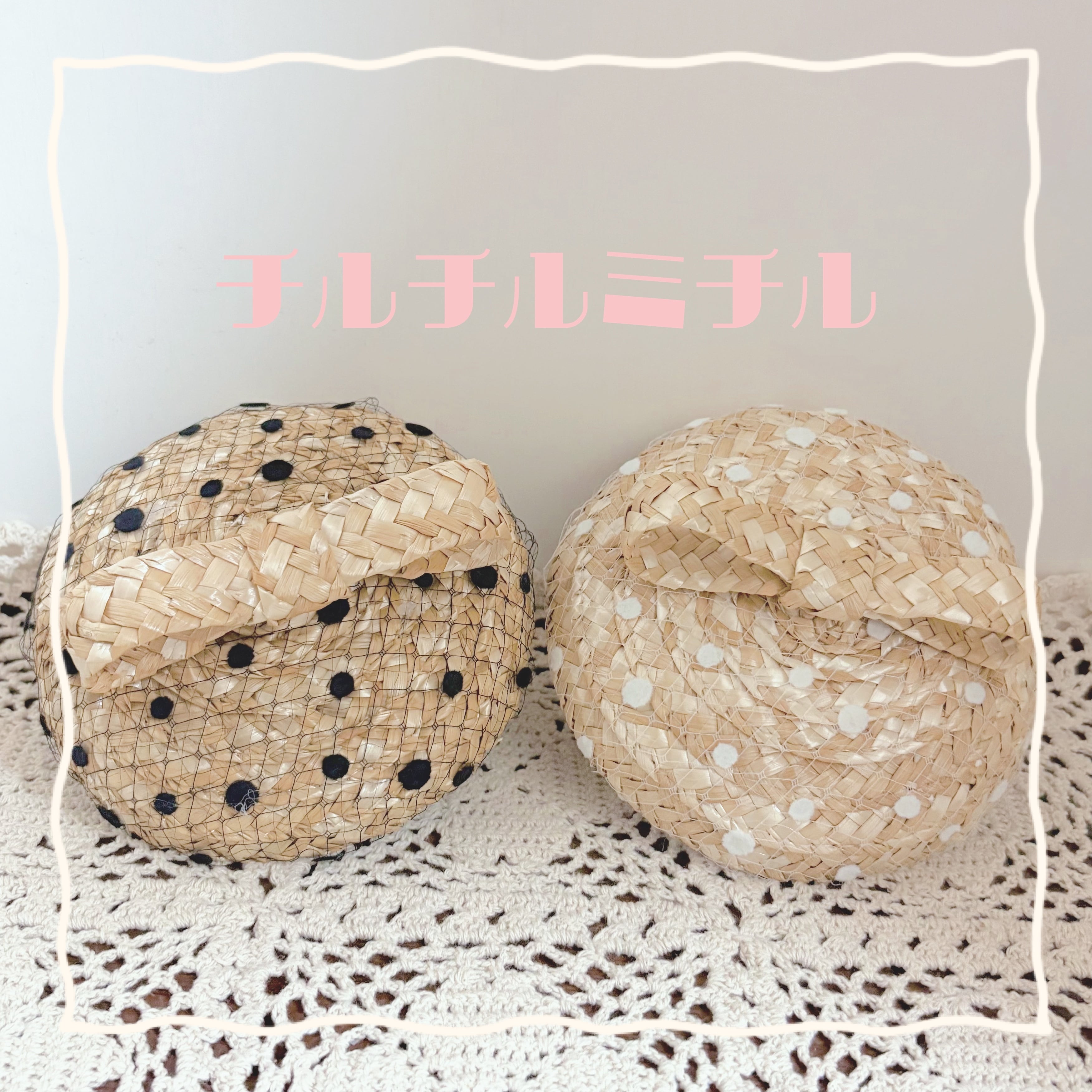 麦わら素材のトーク帽に水玉チュールを重ね