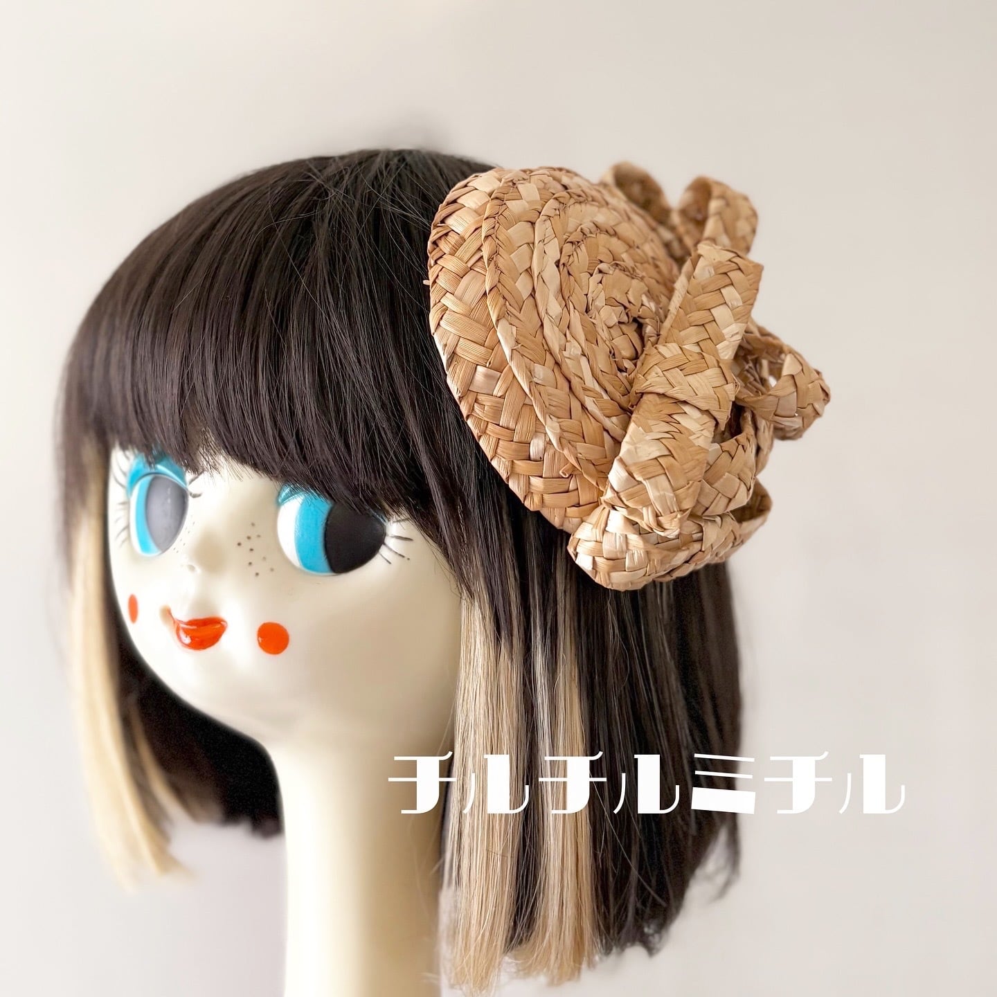 麦わら素材の土台に麦わらのリボンをいっぱい飾りました